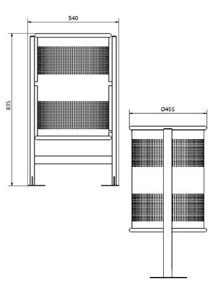 Basurero fabricado en lámina perforada reforzado con 2 aros a los extremos. El columpio es de tubo rolado con base redonda barrenada para fijarlo al piso.