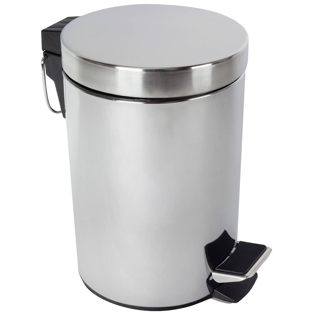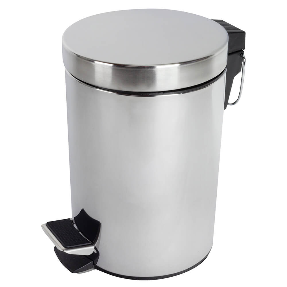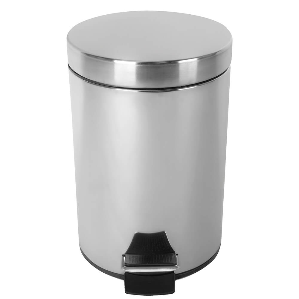 Basurero circular con apertura de tapa mediante pedal; de alta resistencia a la corrosión, prevista con cubo interior de plástico con asa.