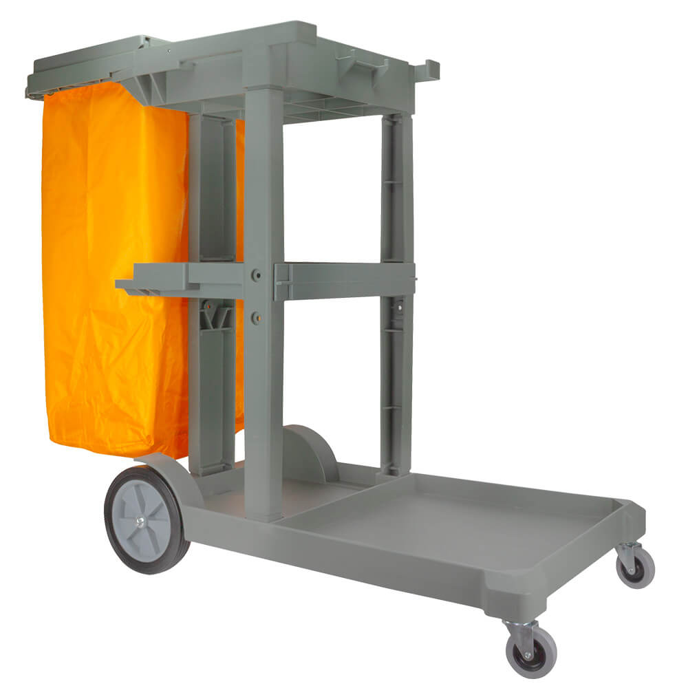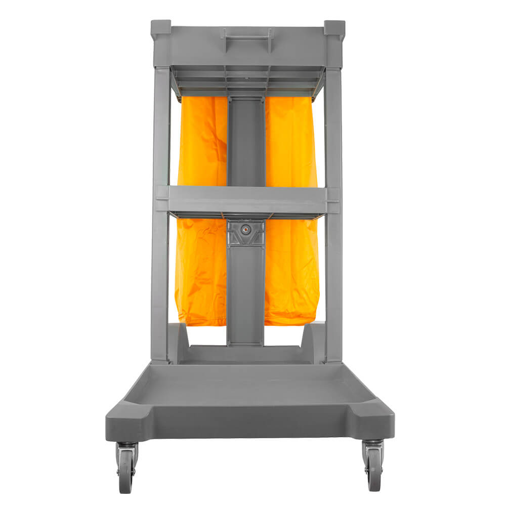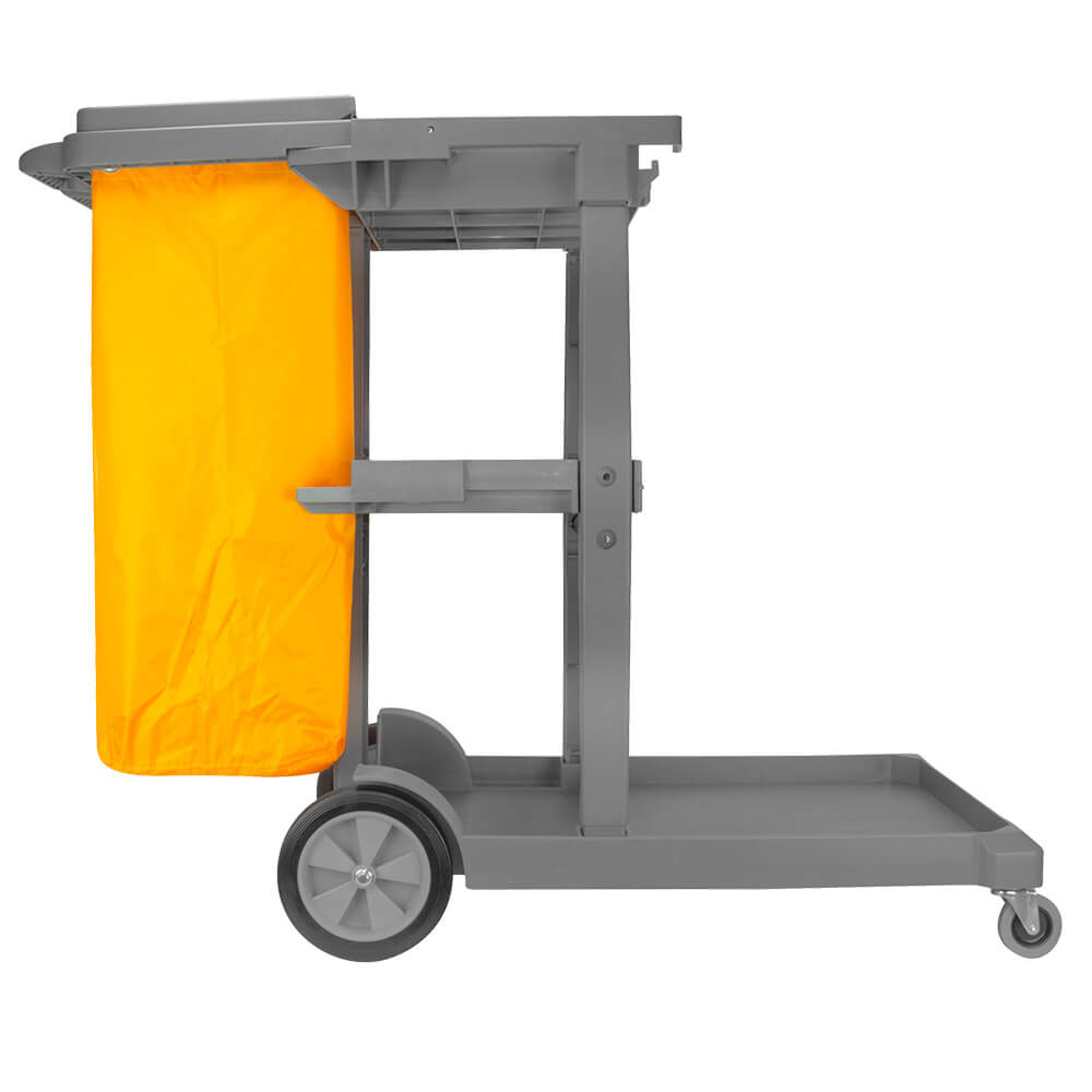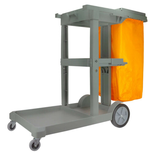Carro de servicio eco gris con saco de color amarillo más tapa. Chasis rígido, resistencia, robusto y de larga duración, 1 bandeja grande inferior y 2 pequeñas superior.