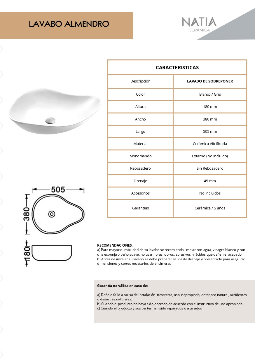 LAVABO CERAMICO DE SOBREPONER MOD. ALMENDRO BLANCO NATIA Ir directamente al contenido