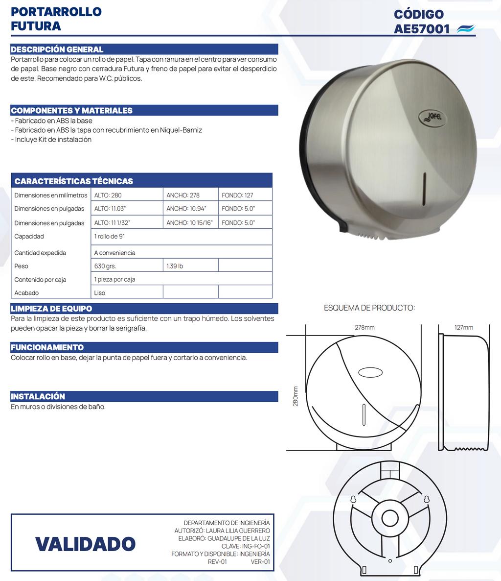 Base negro con cerradura Futura y freno de papel para evitar el desperdicio de este. Recomendado para W.C. públicos.