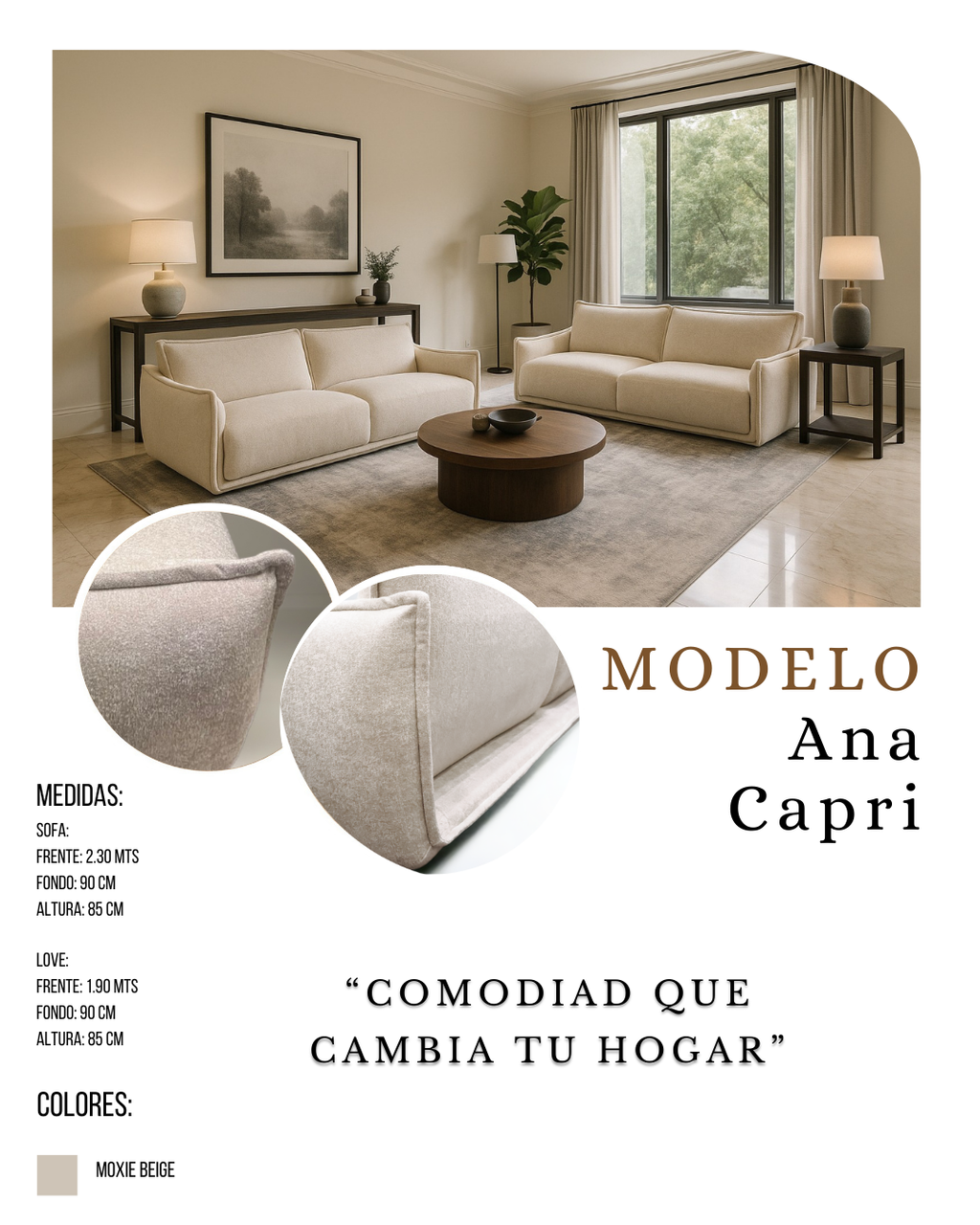 La salaAna Caprien tono Moxie Beigerefleja un diseño contemporáneo con líneas suavesy elegantes, ideal para quienes buscan armonía entre estilo y comodidad. Sus formas amplias y cojines generosos invitan al descanso, creando un ambiente acogedor y sofisticado. El tapizado en tono beige aporta versatilidad y calidez, permitiendo combinarla fácilmente con distintos estilos de decoración, desde los más modernos hasta los más clásicos. Con la sala Ana Capri, cada espacio se transforma en un lugar de confort y distinción, perfecta para reuniones familiares o para disfrutar de momentos de tranquilidad.