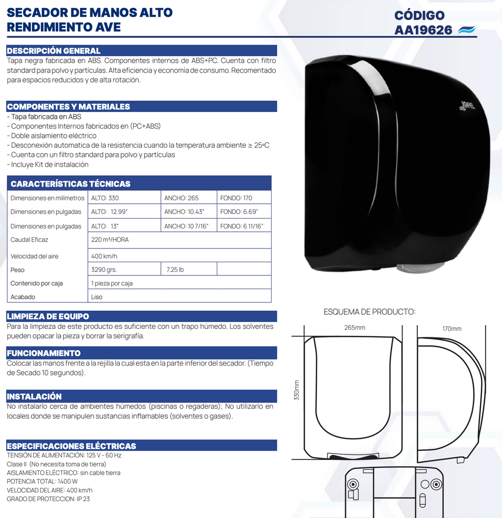 SECADOR DE MANOS ALTO RENDIMIENTO AVE NEGRO AA19626