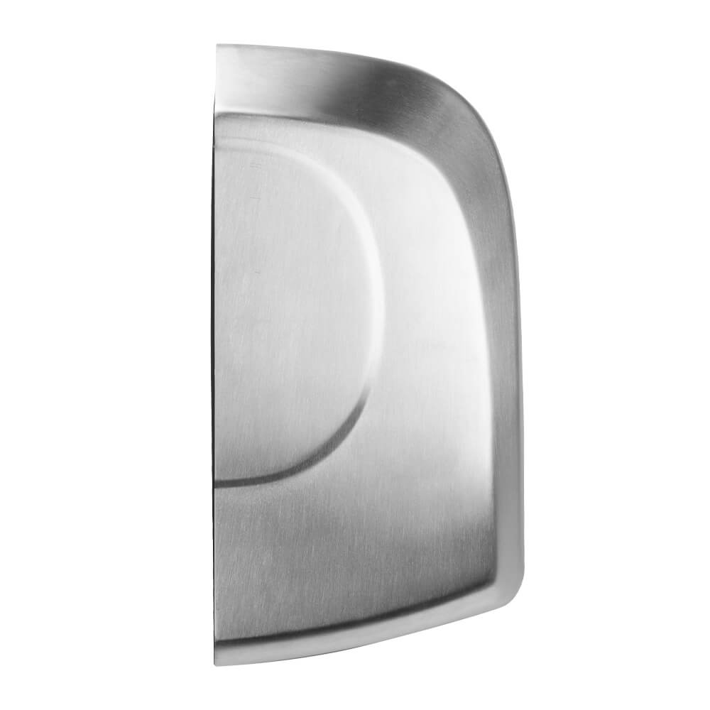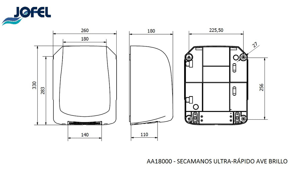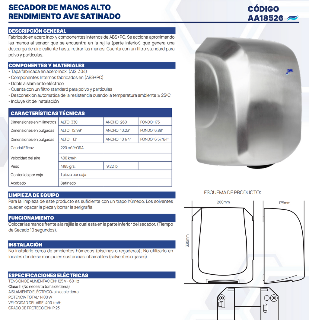 Fabricado en acero Inox y componentes internos de ABS+PC. Se acciona aproximando las manos al sensor que se encuentra en la rejilla (parte inferior) que genera una descarga de aire caliente hasta retirar las manos.