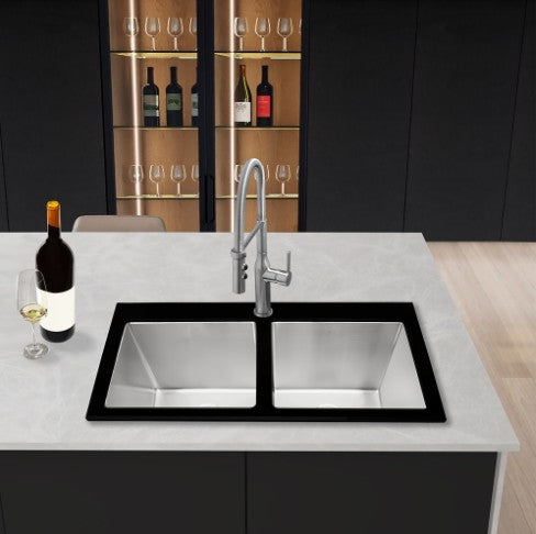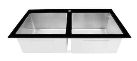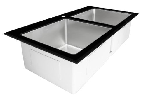 Tarja de acero inoxidable doble tina de gran profundidad con cubierta de cristal negro, instalación de Empotrar.