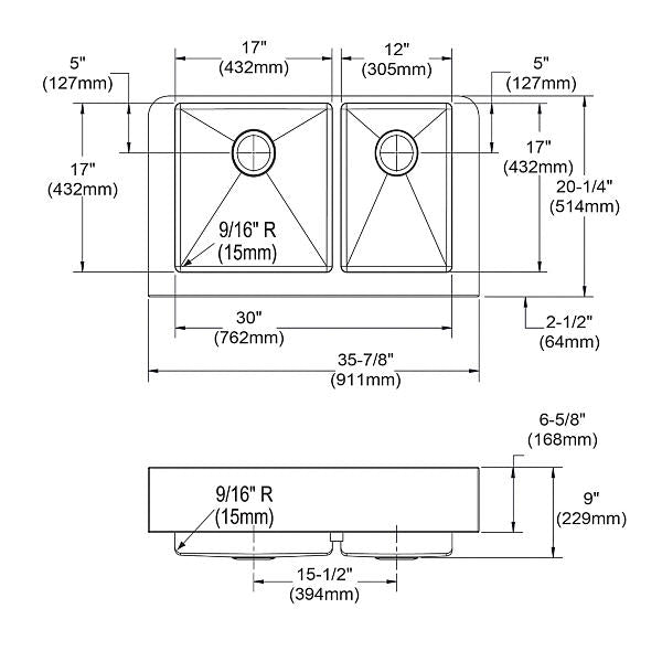 Fregadero de granja de dos cubetas Crosstown® de acero inoxidable calibre 18 de 35-7/8" x 20-1/4" x 9" 60/40